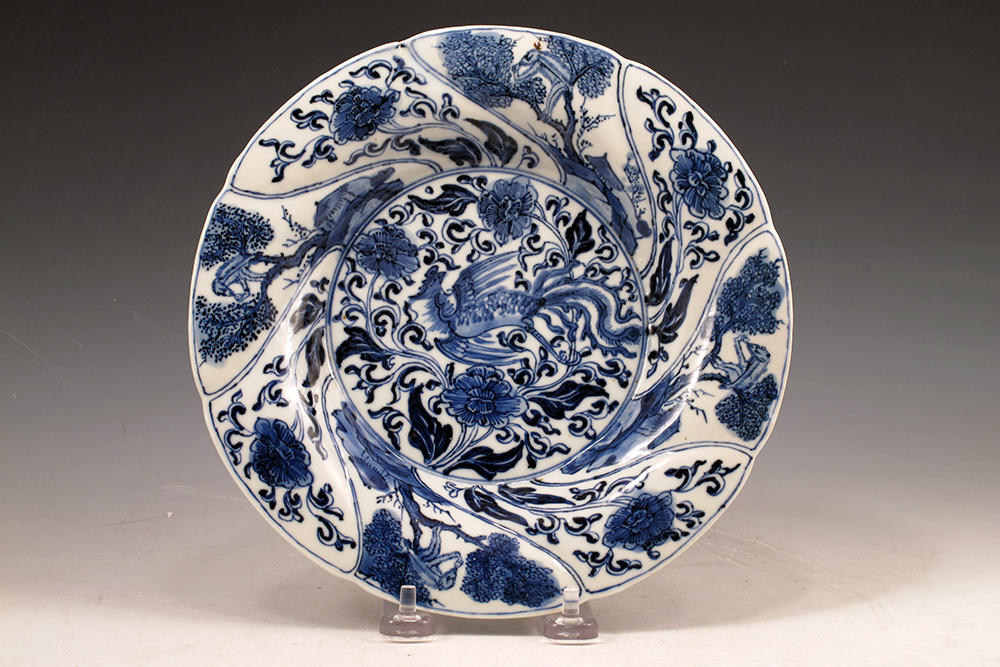 The long reign of the Emperor Kangxi (1661-1722) is associated with, among other cultural achievements, the production of some truly fine blue and white porcelain, and these two lobed dishes represent some of the quality that denotes this period. Characterized by a fine white porcelain hand-decorated with brilliant cobalt blue designs under a fine clear glaze. Here we have an octagonal central scene with a classic Chinese landscape within a lobed border of smaller landscape scenes alternating with images of flowering branches. The form almost certainly inspired by European silver forms of the mid-17th century. The dishes measuring 8 1/2″ in diameter, the reverse even decorated with images representing flowers of the four seasons, centered with a simple mark resembling a stamped seal. One dish with a firing line to the reverse and two extremely minor rim frits, otherwise very good condition. Circa 1690s. $2,600.00 the pair. Sold