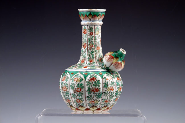 An exquisitely modeled pair of Chinese export porcelain Kangxi period famille verte libation cups, whimsically decorated with figures of dragons at the handle and spout. With only a short sealed line and minor frits and edge losses restored, these charming little pieces of a sculpture are in otherwise good condition, measuring 2 1/4″ x 4 1/2″ and dating to circa 1700-1720. SOLD.