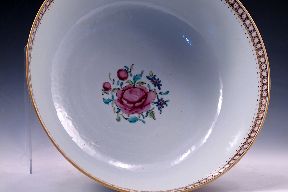 A very handsome late Yongzheng/early Qianlong period Chinese export porcelain Dutch armorial dinner plate centered with the Arms of De Jonge, finely enameled and gilded, within a cavetto border and rim decoration of meticulously painted underglaze blue floral designs. Peony blossoms and butterflies are scattered about the rim on the reverse. The arms were borne by Cornelis de Jonge (1687-1743), a VOC official in Bengal, and also by his son Dr. Christian de Jonge (1730-1790). Measuring 9″ in diameter, and in good condition with the exception of a small rim line sealed. Circa 1735-1740. Illustrated in Kroes’ Chinese Armorial Porcelain for the Dutch Market, page 198.