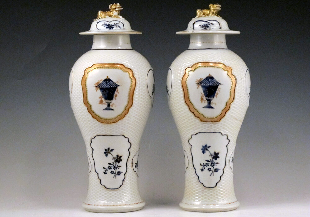 A handsome pair of Chinese export porcelain baluster form garniture vases with panels of blue and gilt decoration featuring classical urns, flowers, and butterflies against a finely molded basket weave ground with foo lion covers. Exemplifying the neoclassical influence that was so popular in the late 18th and early 19th century, the spare, elegant decoration popular during the early years of our new republic. Measuring 11 1/2″ tall with a small firing line to the body of one, and minor restoration to covers, otherwise very good condition. Circa 1790s/1800.