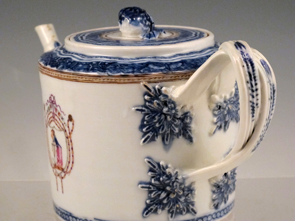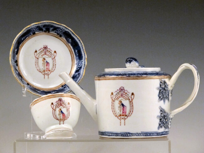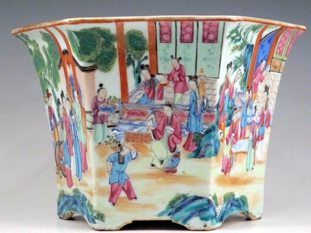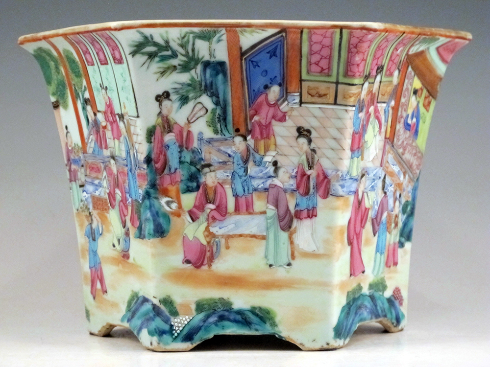 A fine Chinese export porcelain hexagonal form cachepot with its original footed stand, hand-painted with a continuous courtly Mandarin scene, richly colored and detailed, to be appreciated from any angle. The cachepot rim and borders on the stand all rendered with flowering sprigs, blossoms, insects and butterflies. The cachepot with its stand measuring 7 3/4″ tall and at it’s widest 9 1/2″ across. In good condition, ready to display a favorite summer plant or, always beautiful during colder months massed with orchids. Circa 1820.