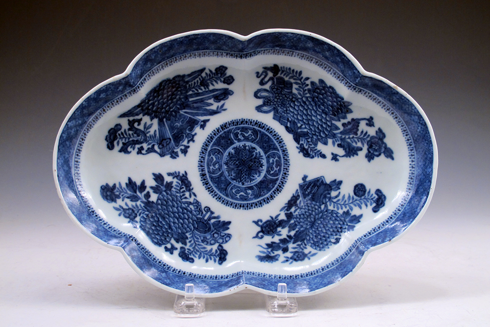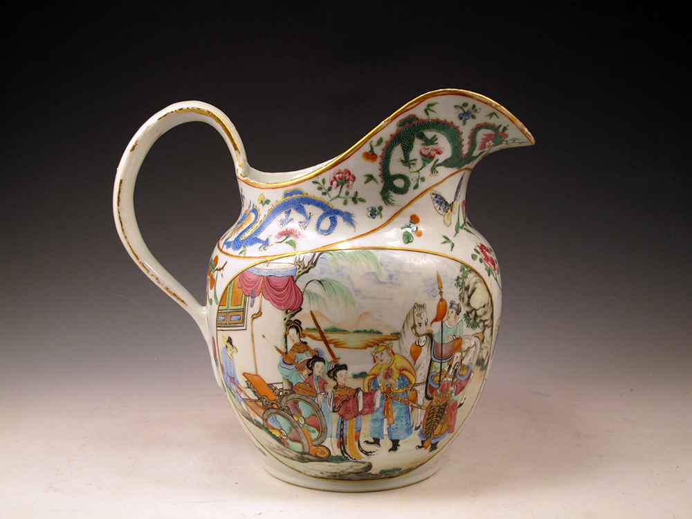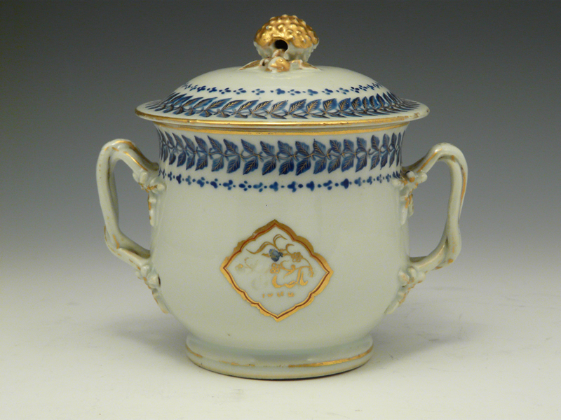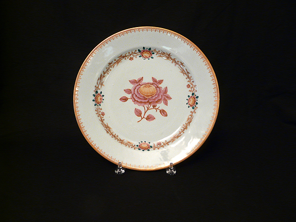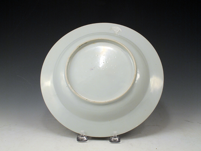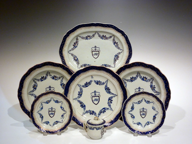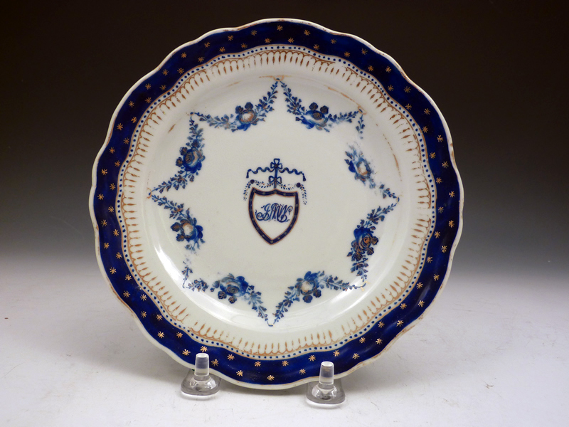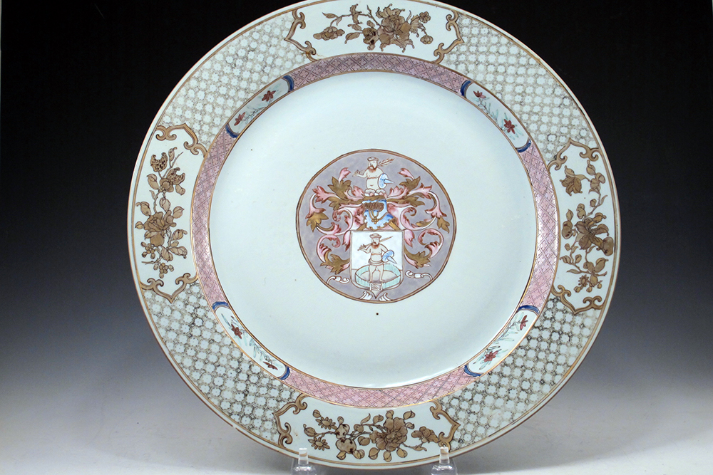 An especially lovely example of Chinese export porcelain made for the English market, this elegant 9″ plate is decorated in famille rose enamels with the arms of Napier of Ballikinrany. The design is centered with a quatrefoil reserve with a European town scene, the family arms rest on the bottom border, and their crest at the top, alternating with two charming scenes within rococo cartouches that are usually associated with the “Valentine pattern” depicting such romantic imagery as a pair of faithful dogs, and a pair doves resting upon Cupid’s quiver while a heart burns upon an altar of love. Very good condition with only a very minor line sealed. Illustrated in Howard’s Chinese Armorial Porcelain, Vol. I, page 320. Circa 1745.