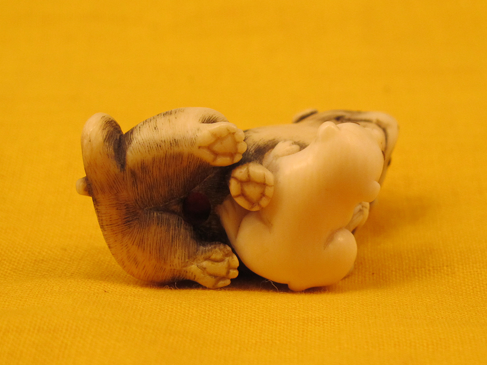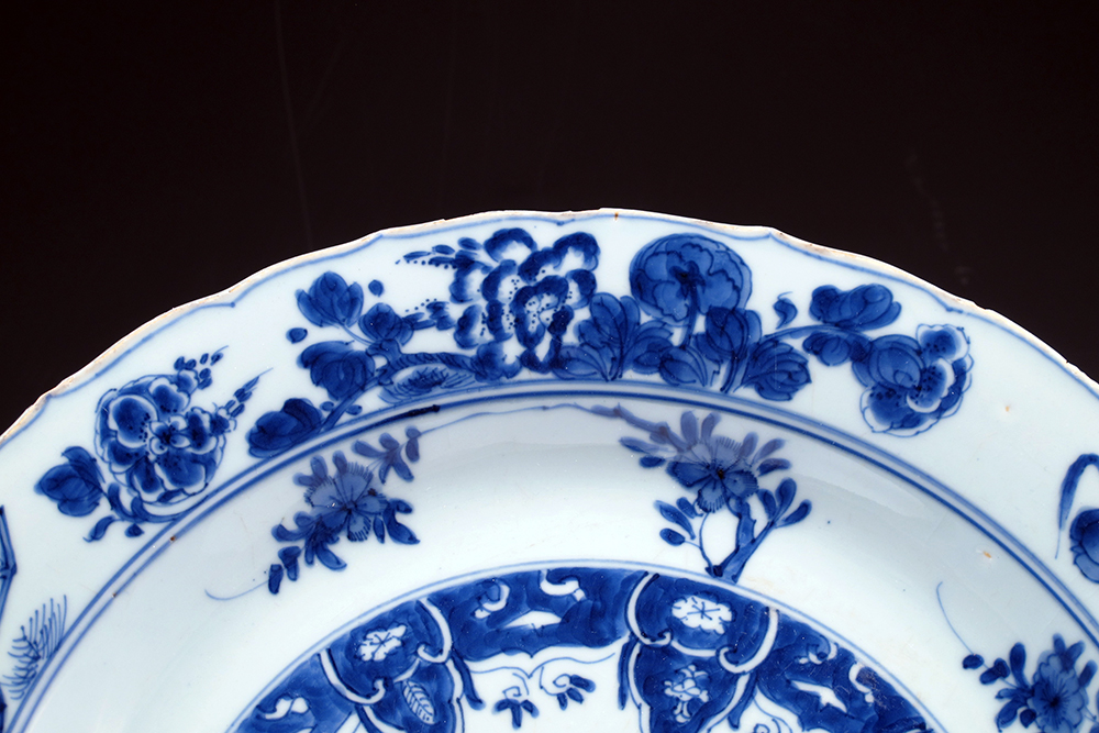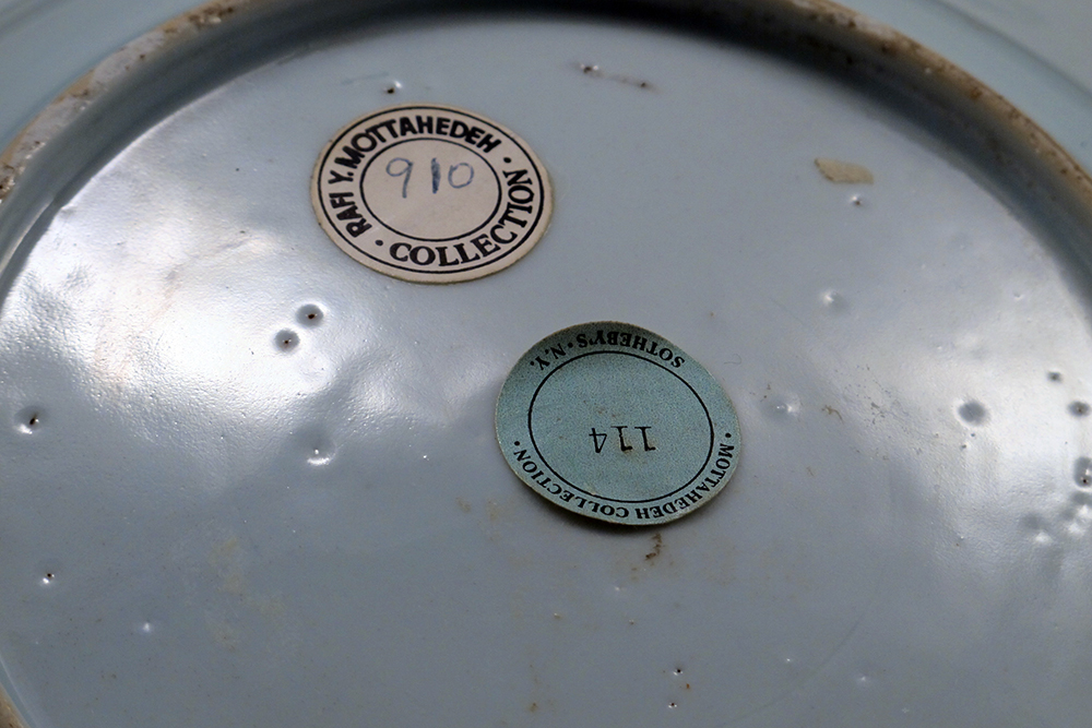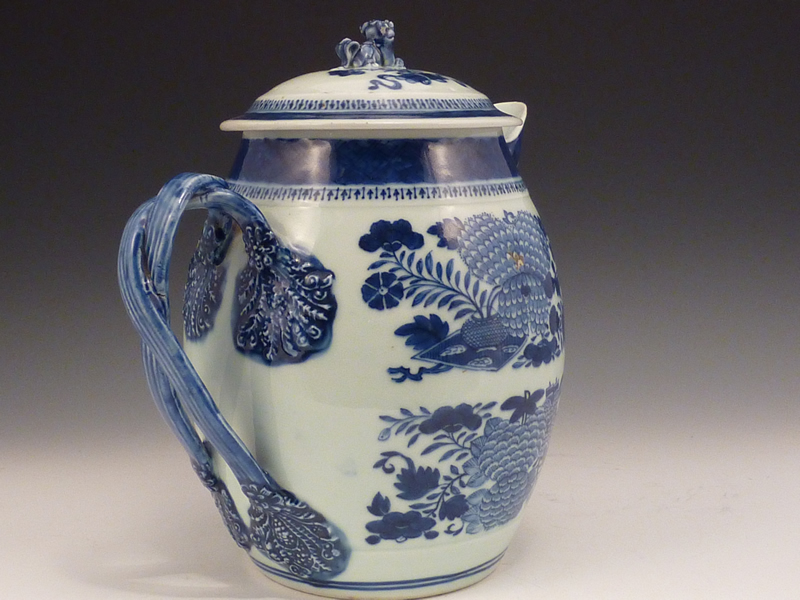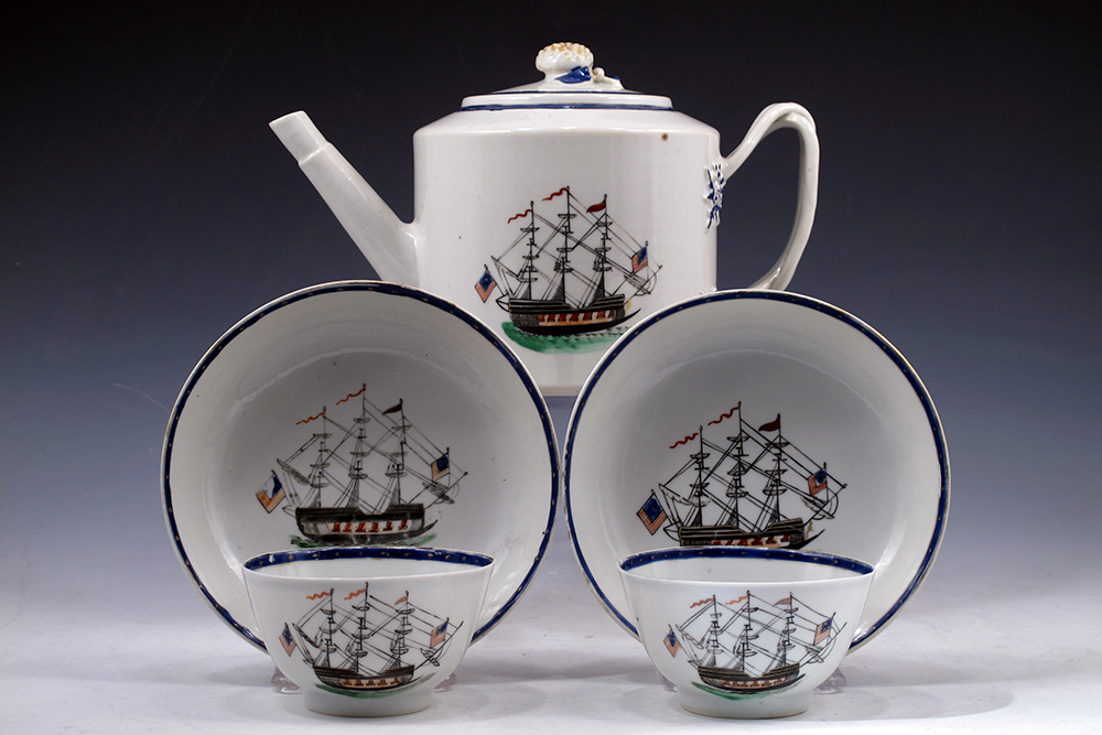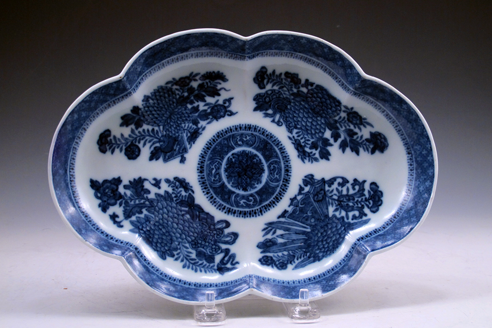An especially lovely example of Chinese export porcelain made for the English market, this elegant 9″ plate is decorated in famille rose enamels with the arms of Napier of Ballikinrany. The design is centered with a quatrefoil reserve with a European town scene, the family arms rest on the bottom border, and their crest at the top, alternating with two charming scenes within rococo cartouches that are usually associated with the “Valentine pattern” depicting such romantic imagery as a pair of faithful dogs, and a pair doves resting upon Cupid’s quiver while a heart burns upon an altar of love. Very good condition with only a very minor line sealed. Illustrated in Howard’s Chinese Armorial Porcelain, Vol. I, page 320. Circa 1745.